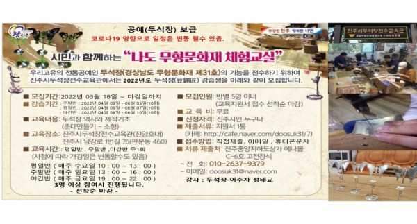보급하기 위하여 2022년 진주시두석장전수교육관 강습 프로그램을 개최합니다.
